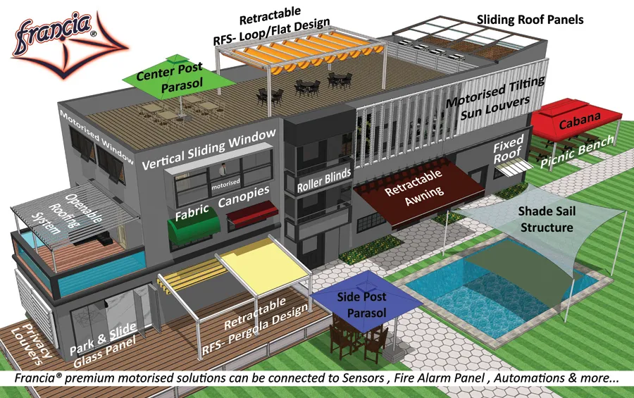 We provide premium outdoor shading solutions, including parasols, tensile models, louvers, retractable systems, and motorized awnings. Built with durable aluminum alloy frames and customizable in size, shape, and fabric color, our products suit both residential and commercial use. >